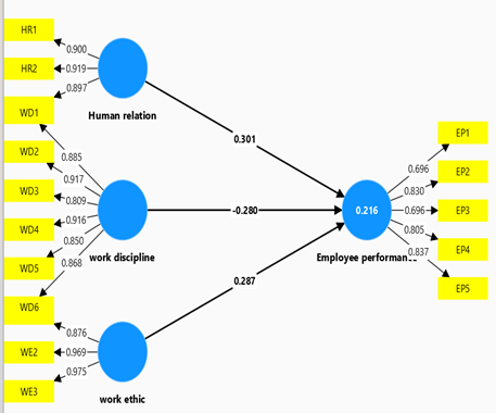 This study examines the influence of human relations, work discipline, and work ethic on employee performance. Using a quantitative approach with a survey research design, data were collected from 250 employees in the manufacturing industry through a validated questionnaire. Data analysis was conducted using SEM-PLS to test the research hypotheses. The results indicate that human relations and work ethic significantly improve employee performance, with each variable positively influencing and supporting the proposed hypothesis. However, work discipline contributes significantly negatively. Specifically, good human relations facilitate collaboration and motivation, work discipline decreases efficiency and consistency, and work ethic encourages commitment and dedication to tasks. These findings underscore the importance of managing interpersonal relationships, reviewing to reduce disciplinary strictness, and strengthening the work ethic in achieving employee success. The practical implication of this study is the urgent need for organizations to develop training programs and work cultures that support these three aspects to optimize employee performance.References
